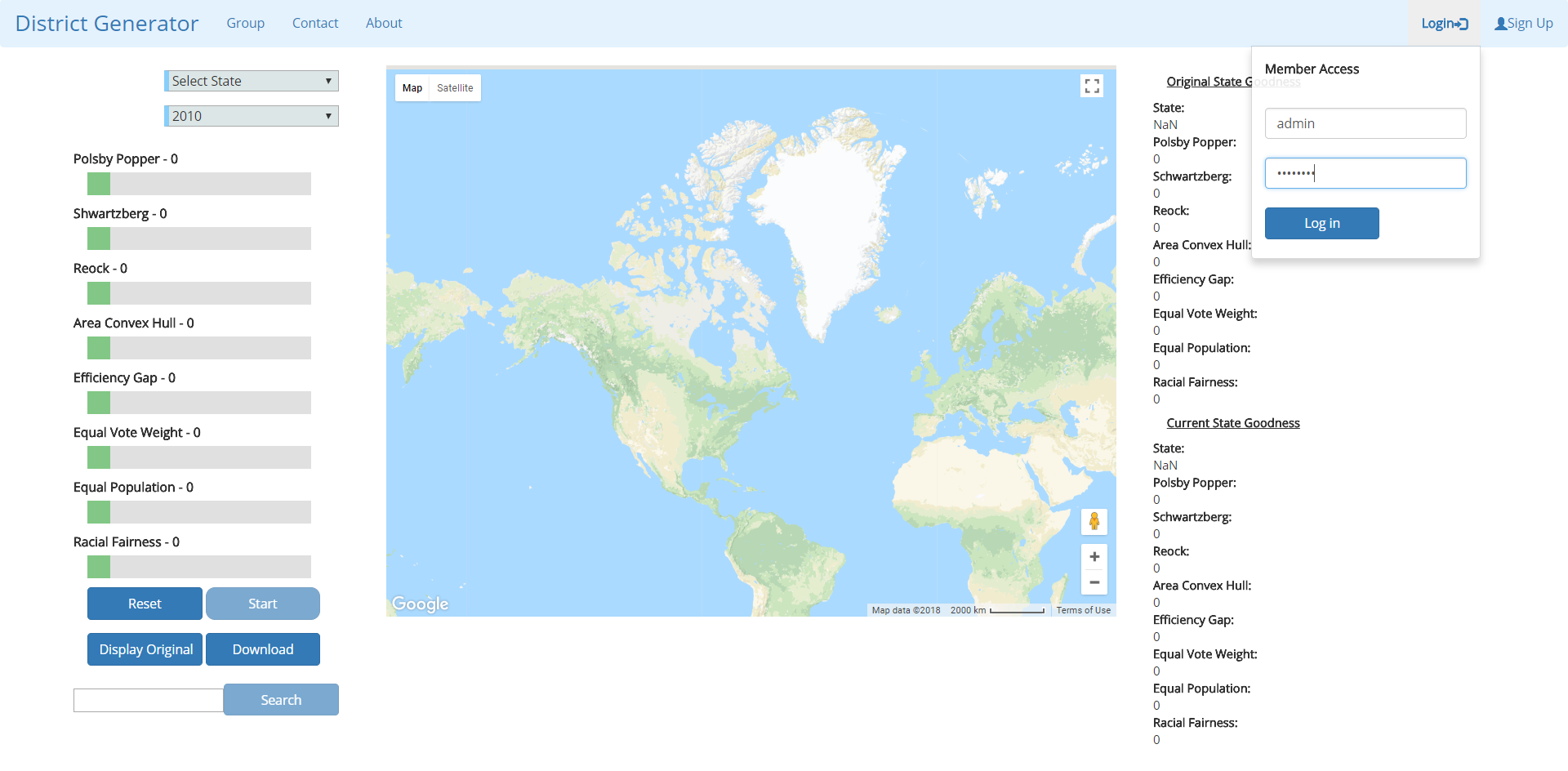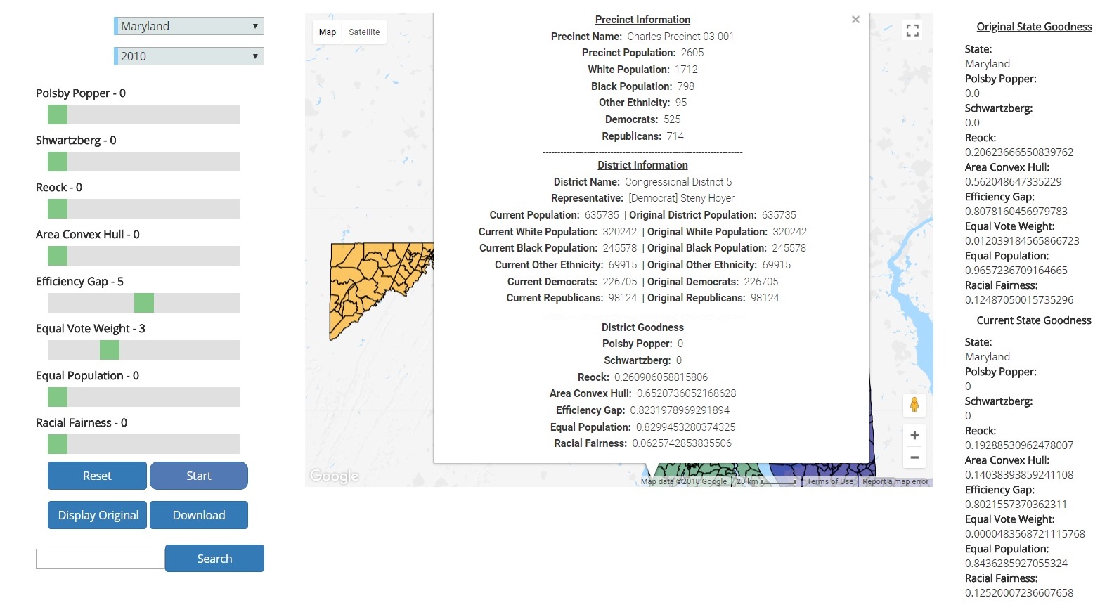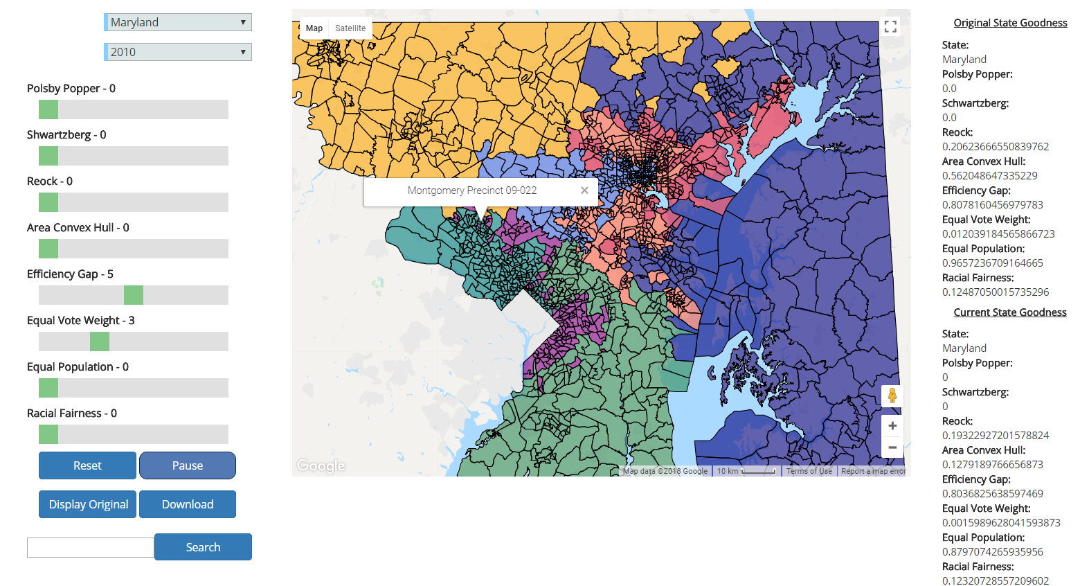 Setting a few objective measures (will redistrict based chosen measures) and hovering over a precinct, which brings up an info window
