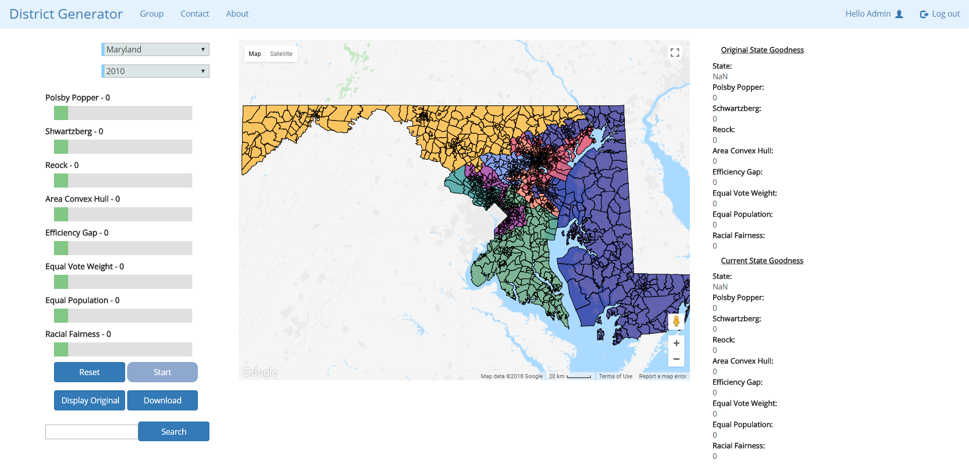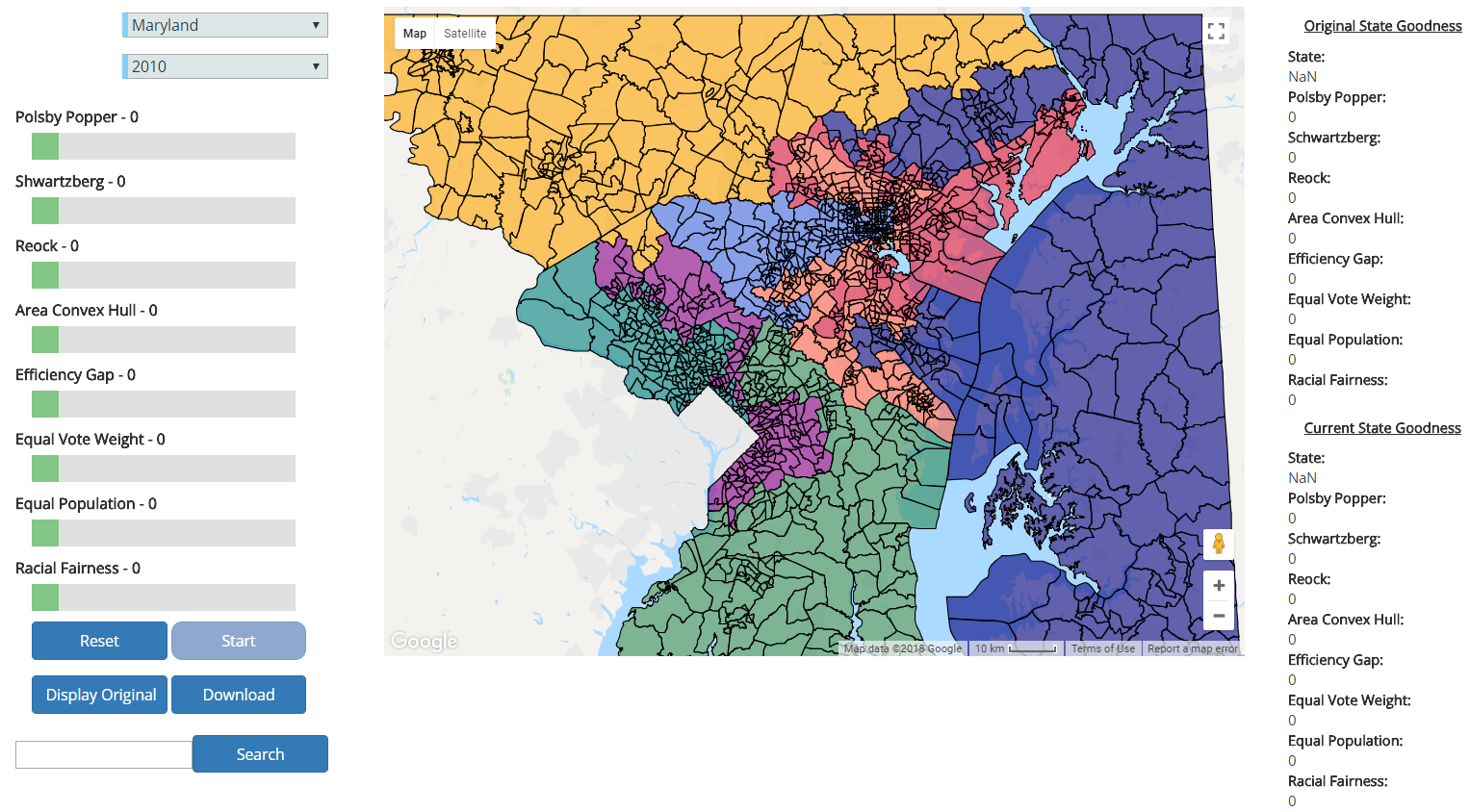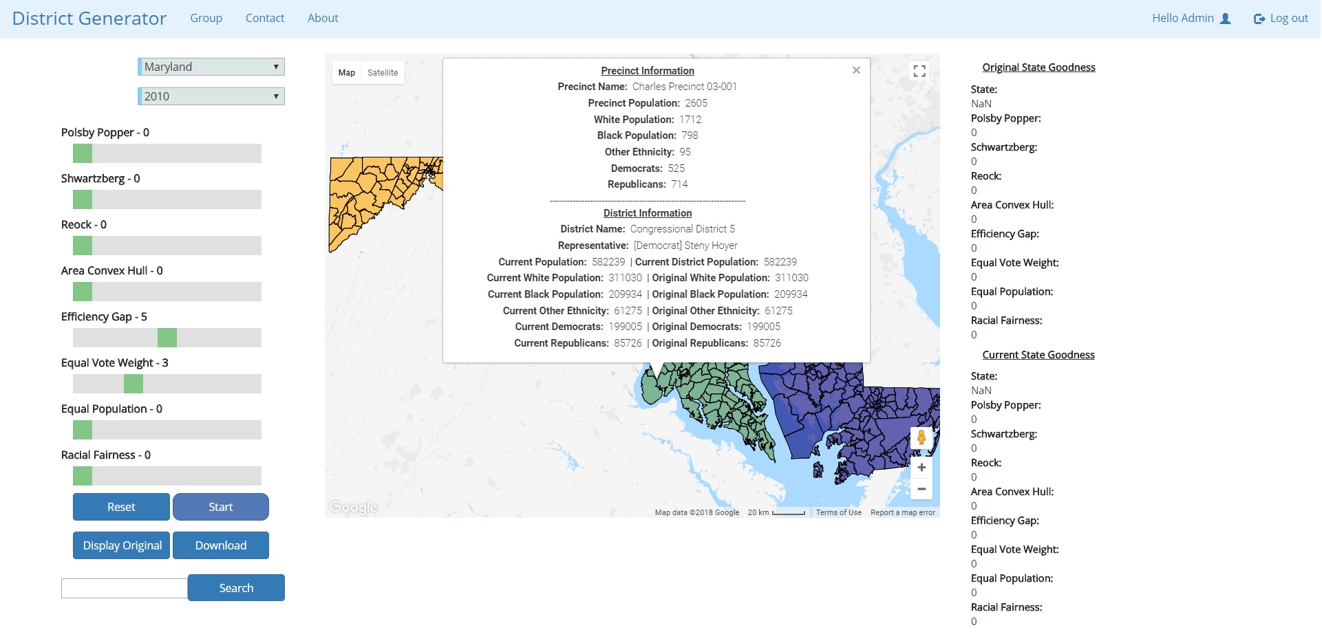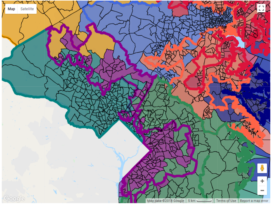 GUI after logging in and selecting the state of Maryland. Precinct boundaries are visible. Districts are organized by color.